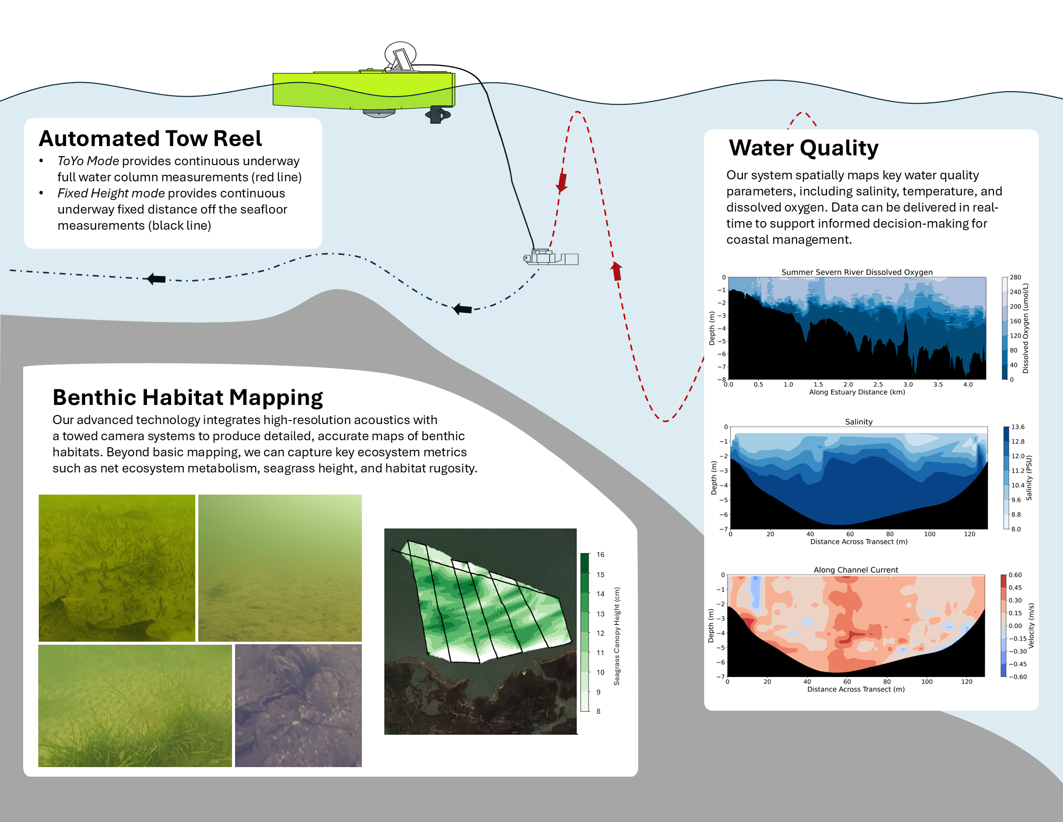 Featuring an automated reel, The Severn can effortlessly operate in tow-yo mode, sampling the entire water column with precision, or stay at a fixed distance off the bottom collecting near-bed variables like dissolved oxygen. Additionally, its Acoustic Doppler Current Profiler (ADCP) adds to its data capabilities collecting water column current velocities.